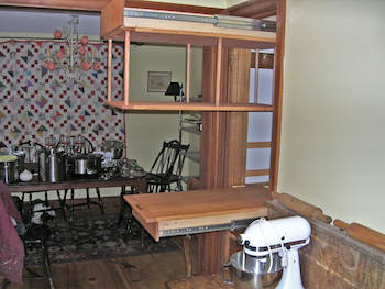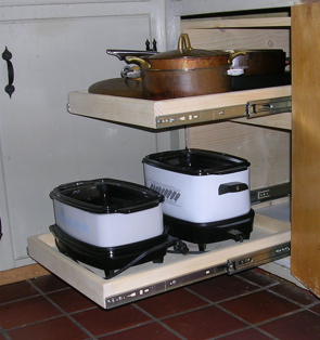 A standard early kitchen cabinet with minimal shelving can be outfitted with pullouts for pans (right) and upright storage for trays and boards. |